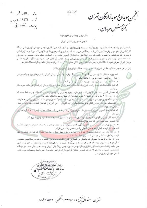 با احترام در پاسخ به نامه شماره 2127/41 مورخه 21/7/90 از آنجا که خویشکاری انجمن موبدان تهران دادن دیدگاه کارشناسی از نظر دین و فرهنگ زرتشتی است به آگاهی می رساند که تصاویری که به عنوان نگاره اشوزرتشت، پیامبر ما زرتشتیان توسط هر هنرمند نقاشی به تصویر کشیده شود در ابتدا نظر به اینکه آن تصویر مقدس قرار است در یک مکان عمومی در معرض دید جامعه محترم زرتشتیان یا غیرزرتشتیان قرار گیرد می بایستی قبل از هر اقدامی آن نقاش هنرمند را به هر شکل ممکن به انجمن موبدان تهران معرفی نمود تا نکات الزام به رعایت آن را به آن نقاش محترم تذکر داد تا در آینده دیگر شاهد اینگونه مسایل نباشیم.