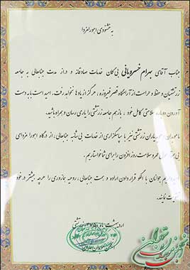 هموندان انجمن موبدان تهران 19 ارديبهشت‌ماه برابر با ورهرام ایزد و اردیبهشت ماه به ديدار از بهرام خسروياني - خادم چندین و چند ساله آرامگاه قصر فیروزه تهران-رفتند. در این نشست دوستانه که بامداد سه شنبه صورت گرفت، هموندان انجمن موبدان از تلاش‌هاي درازمدت خدمتگزار آرامگاه قصر فيروزه سپاسداري نمودند و با پیشکش هدیه یادبود و سپاس نامه ای برای او آرزوی تندرستی، دیرزیوی و شادزیوی کردند.