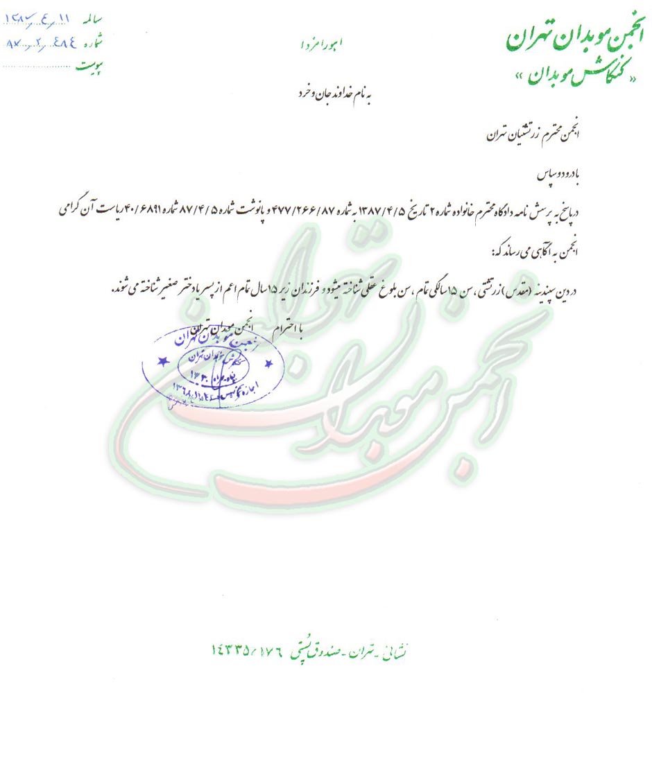 چندی پیش دادگاه خانواده تهران با نامه نگاری، پیرامون سن بلوغ از دیدگاه دین زرتشتی، از انجمن زرتشتیان تهران پرسشی نموده بود.انجمن زرتشتیان تهران نیز رونوشتی از این نامه را به انجمن موبدان فرستاد تا پاسخ دینی و فقهی این انجمن را جویا شود.