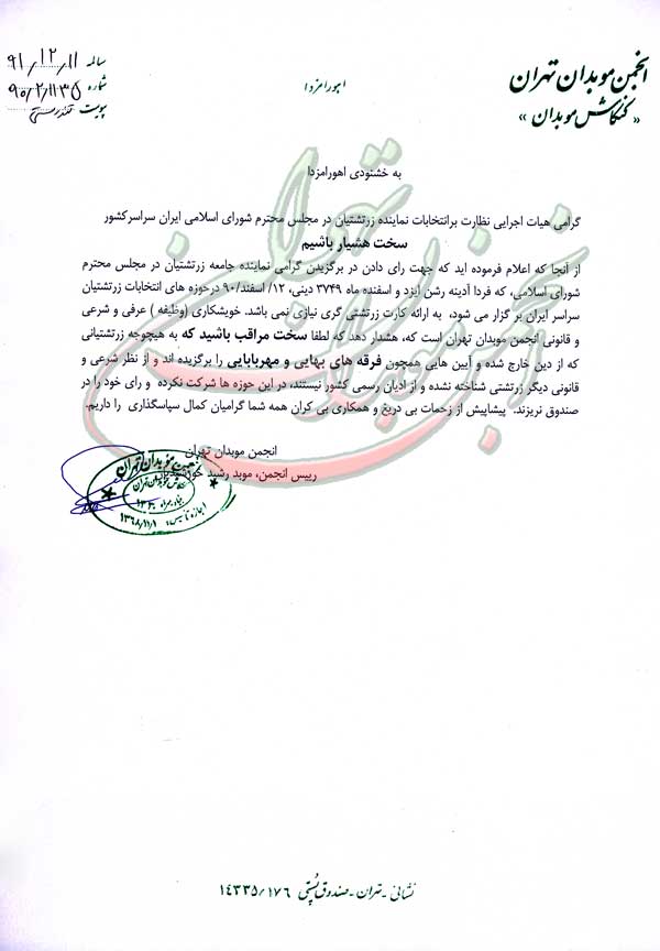 از آنجا که اعلام فرموده اید که جهت رای دادن در برگزیدن گرامی نماینده جامعه زرتشتیان در مجلس محترم شورای اسلامی، که فردا آدینه رشن ایزد و اسفنده ماه 3749 دینی، 12/ اسفند/90 درحوزه های انتخابات زacرتشتیان سراسر ایران بر گزار می شود، به ارائه کارت زرتشتی گری نیازی نمی باشد. خویشکاری (وظیفه) عرفی و شرعی و قانونی انجمن موبدان تهران است که، هشدار دهد که لطفا سخت مراقب باشید که به هیچوجه زرتشتیانی که از دین خارج شده و آیین هایی همچون فرقه های بهایی و مهربابایی را برگزیده اند و از نظر شرعی و قانونی دیگر زرتشتی شناخته نشده و از ادیان رسمی کشور نیستند، در این حوزه ها شرکت نکرده و رای خود را در صندوق نریزند. پیشاپیش از زحمات بی دریغ و همکاری بی کران همه شما گرامیان کمال سپاسگذاری را داریم.