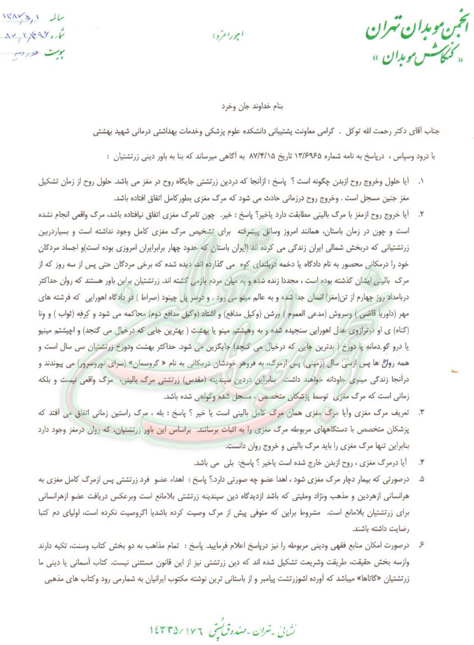 انجمن موبدان در پاسخ به نامه دکتر رحمت الله توکل(معاونت پشتیبانی دانشکده علوم پزشکی وخدمات بهداشتی درمانی دانشگاه شهید بهشتی) پیرامون تعریف مرگ بالینی و مغزی از دیدگاه زرتشتی و همچنین دیدگاه انجمن موبدان پیرامون اهدای عضو از فردی که مرگ مغزی داشته چنین نوشت: